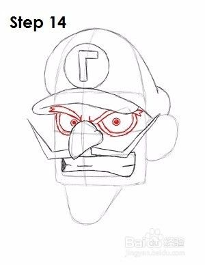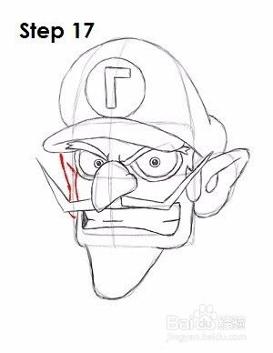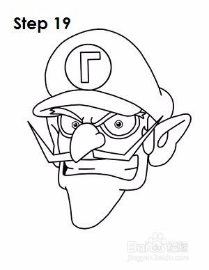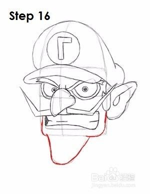 第16步:画下Waluigi的脸,画下巴和尖尖的下巴。只是在主要形状变黑,并使其更加圆润,并围绕他的微笑。