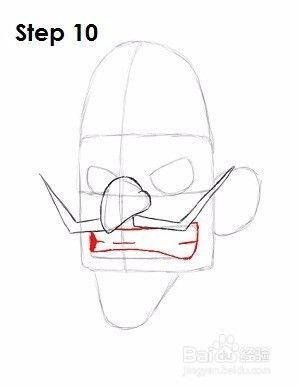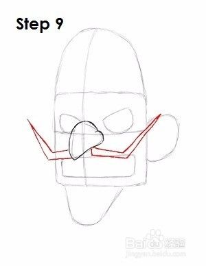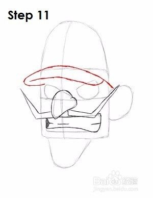 第9步:现在画Waluigi薄而邪恶的胡须。画出一条粗斜线; 它类似于字母L.由于视角的原因,将小胡子的右侧画得更小。