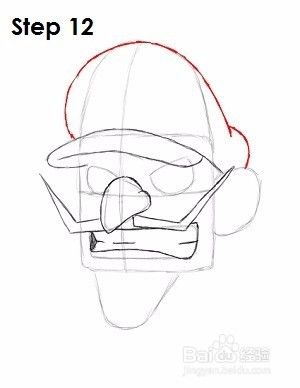 第十一步:对于Waluigi的帽子,从他的右侧,左眼上方画一条线。让这条线向左走一点,然后朝主方形的顶部弯曲,然后将其向下放到耳朵顶部。将帽子的“帐单”绘制成右眼进入左侧的线条。