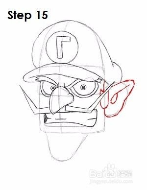 第15步:现在吸取Waluigi的左侧灼伤,它位于帽子下面和胡须后面。它的底部是圆形的,有一个小点可以卷起来。画出他的耳朵时,请多给它一些形状,并使其尖锐。在其中画一些线条来表示这个视频游戏人物耳朵的内部。