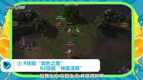 3R技能“血色之盾”:鼓舞友方,恢复生命并获得护甲;R2技能“圣神清算”:制造圣神领域,对范围内的敌人造成伤害。