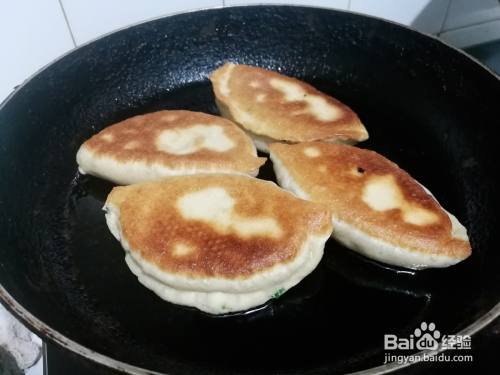 平底不粘锅倒入食用油,放入盒子胚,中火烙制,烙好一面,翻过来烙制另一面。
