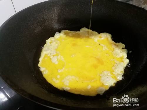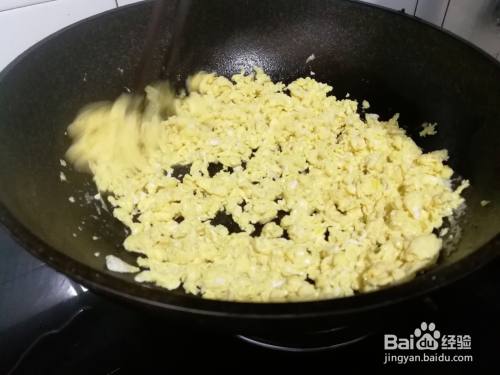 锅中倒入食用油,烧至八分开,磕入鸡蛋,用筷子搅成小块,放入调馅料,盐,生抽,味素拌匀。