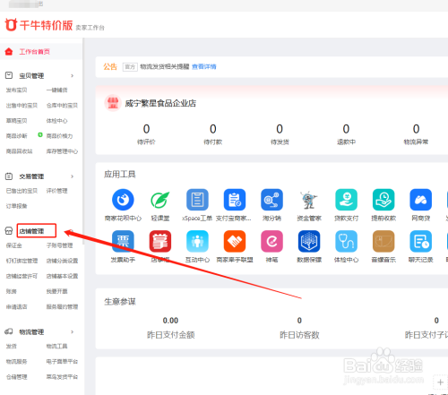 淘宝特价版的主界面左侧工具栏中往下滑动找到“店铺管理”