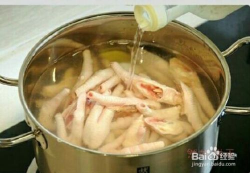 锅里放水、放姜片烧至沸腾,再放入鸡爪加少许白醋。