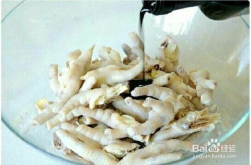 把鸡爪放入盆中加入几大勺盐,搓洗干净,去掉指甲