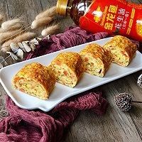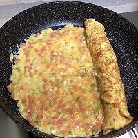 趁蛋液还为完全凝固,把蛋卷裹着新的一层蛋皮,从一端卷起,成为一个大的蛋卷