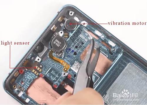 3.4在80℃热风枪吹动下,用塑料卡将振动扬声器从原来的屏幕移至新的屏幕。