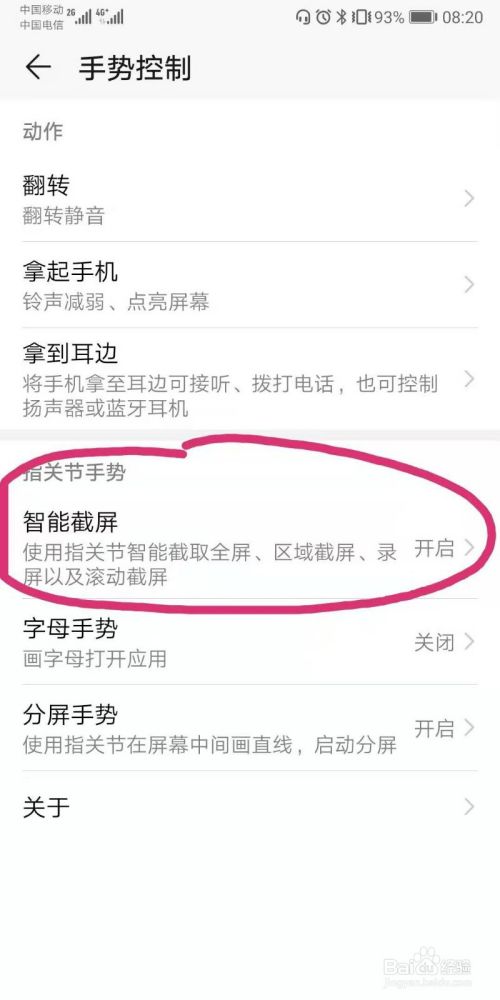 找到"指关节手势 "-- "智能截屏" , 点击进入