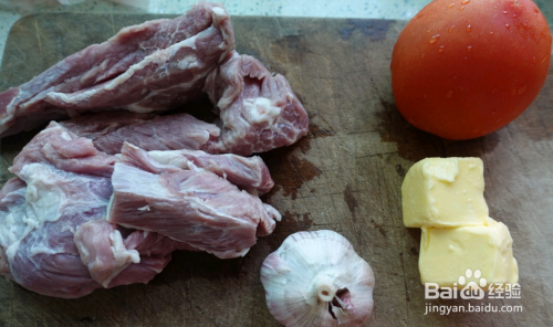 牛肉控干水分,用厨房纸巾擦干表面水分,撒适量盐,准备黄油、已经是切块儿,整个蒜头横切备用