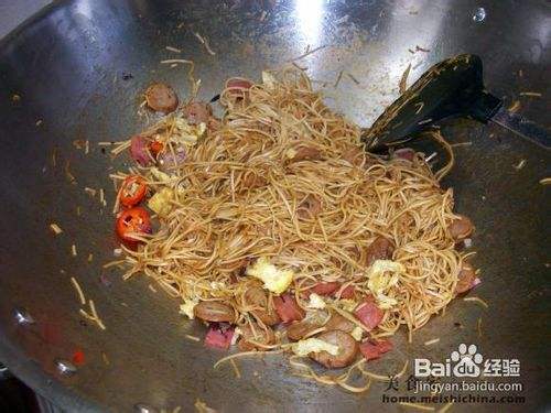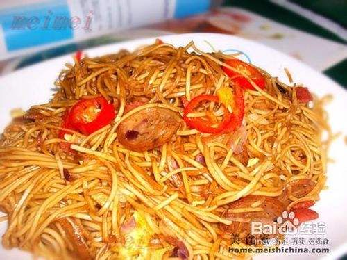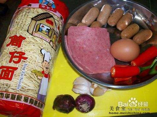 1原料:筒仔面 火腿片 香肠 红辣椒 蒜米 小葱