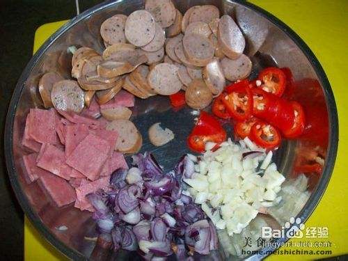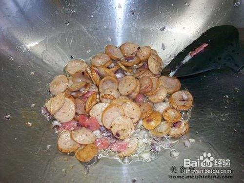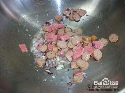 5炒锅中加入适量橄榄油,炒香蒜米及葱,加入火腿片 香肠。