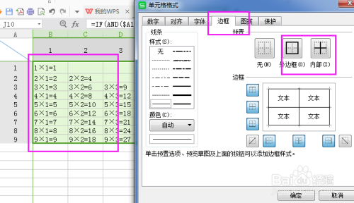 对九九乘法表进行修饰,如对单元格进行边框的填充,“选中数据-右键-单元格格式-边框”如下图操作显示。