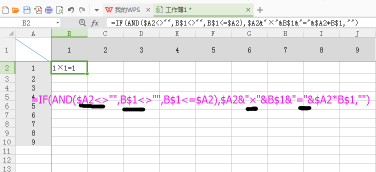 我们知道九九乘法表,是一个楼梯式的表单,第一行只有1*1,第二行也到2*2,所以我们在第二格=IF(AND($A2<>"",B$1<>"",B$1<=$A2),$A2&"×"&B$1&"="&$A2*B$1,""),如下图的操作。