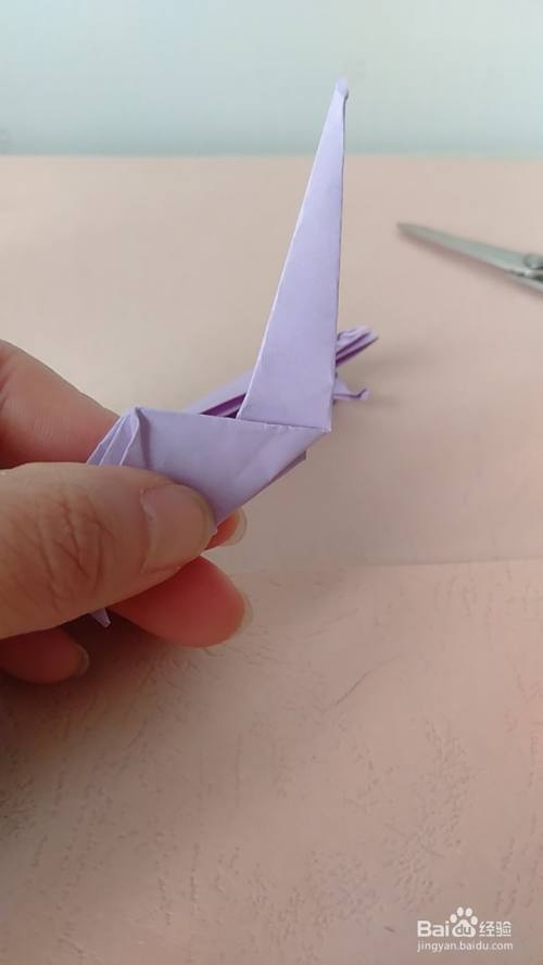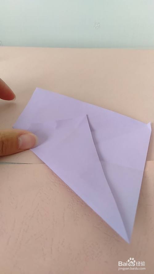 将三角形对折,两边向上折,后面折叠出两个小三角形。