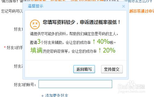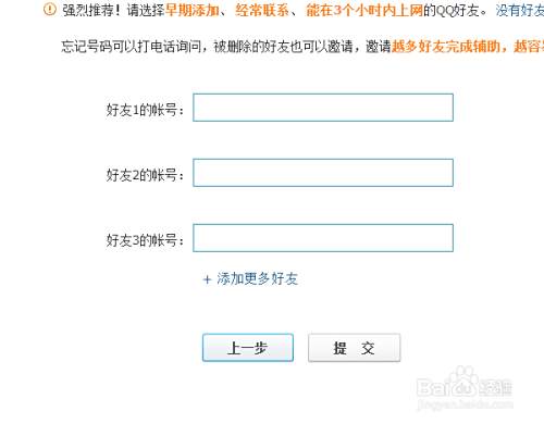 让你加的好友辅助,最好是朋友,经常聊天的,加的时间长的,都可以,点击提交你的朋友会有到一个回执编号。记住提交的时候多填写几个好朋友的号码,朋友帮助你很管用的。