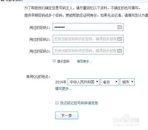 填上之后,就要填用过的密码了,这时候一定要填,你以前用过的密码,而且是越多越好。常用的QQ地点就填你经常登录的地点,因为经常只在一个IP上登录,申诉的几率大。