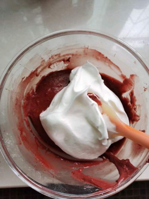 6取三分之一的蛋白和蛋黄糊上下翻拌均匀,再将拌好的蛋糕糊倒入剩余的蛋白内。