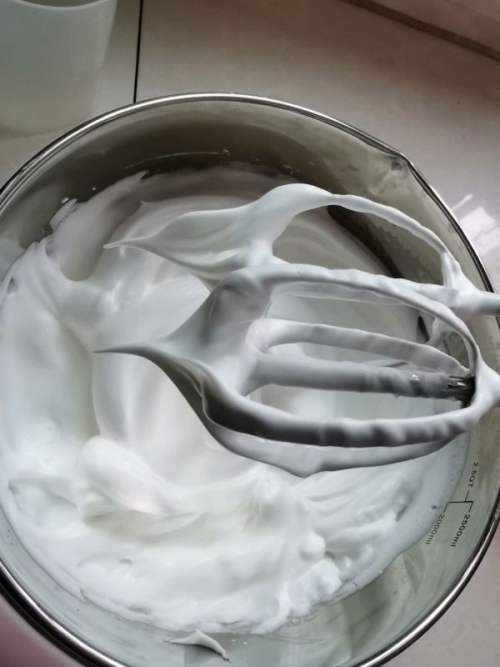 5蛋清内滴入3-4滴柠檬汁,分三次将细砂糖加入蛋清内,打发至干性发泡