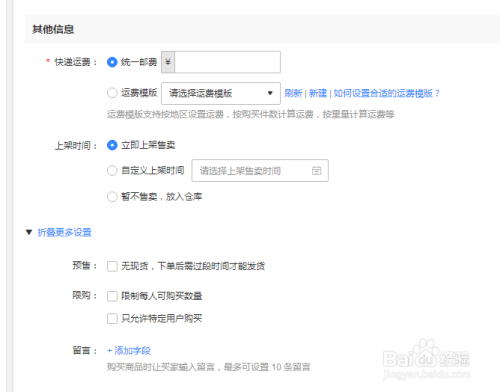 接下来就是运费,是否是统一运费还是不一样的,这个需要我们自己确认,然后就是确认上架的时间,是否立即售卖还是特定时间才开始售卖,还有就是用户是否限购,如下图所示。