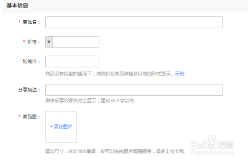 接着就是填写商品的名称、价格、描述、类目、分组以及商品图片,如下图所示。