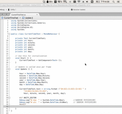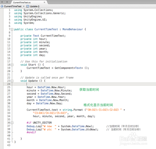 Unity 获取系统当前时间,并格式化显示。通过“System.DateTime”获取系统当前的时间,然后通过格式化把获得的时间格式化显示出来,具体如下