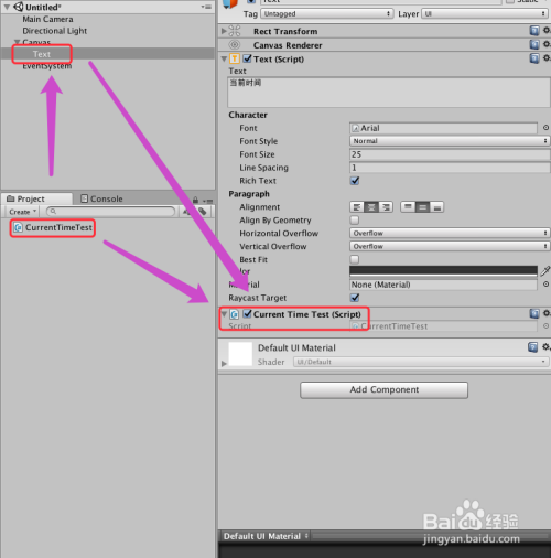 脚本编译正确后,回到Unity界面,在场景中新建一个“Text”,适当调整好位置与大小,然后把“CurrentTimeTest”赋给“Text”,具体如下图