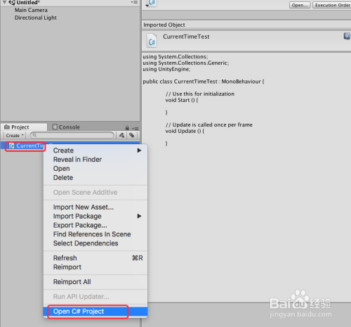 选中“CurrrentTimeTest”,双击脚本或者右键“Open C# Project”,打开脚本,具体如下图