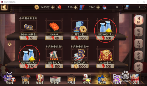 然后,在杂货铺的【特殊】中,我们可以花费勾玉购买一天或三天的经验加成