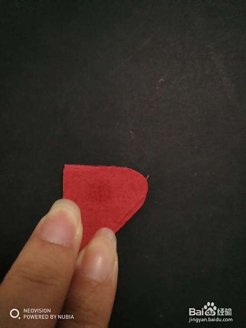 第四步,把三角形按照中线向右对折,然后用剪刀剪出一个弧形。