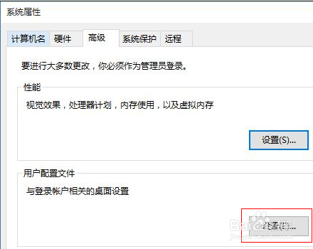 在弹出的系统属性对话框,点击用户配置文件设置按钮进入。