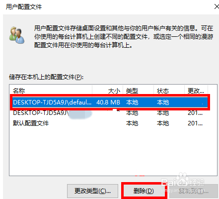 在弹出的用户配置文件对话框,选中储存在本地上的配置文件第一个含有defaultuser信息选项点击删除按钮即可解决。
