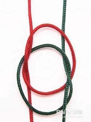 先准备量两条编绳,用红色的绳打成一个松松的大圈,再用绿色绳直线穿过,注意用左边的红绳压住绿绳,再用右边的绿绳压住红绳。同时用绿绳在红绳打结的反方向打一个圈,注意要压住红绳的位置,绿绳在下面红绳在上面,绿绳在上的话红绳就在下面。