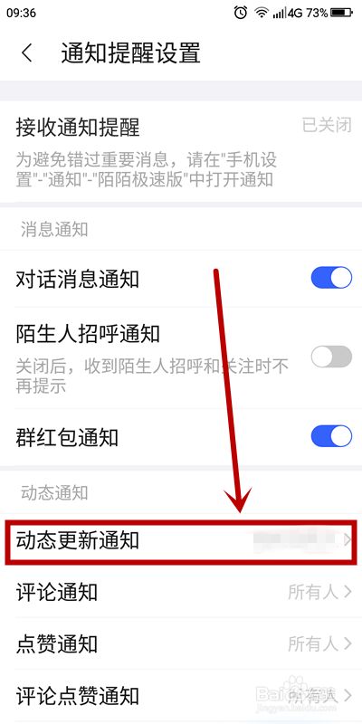 进入【通知提醒设置】页面后,点击【动态更新通知】选项。