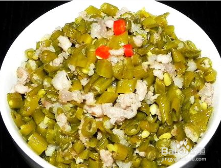 炒锅置旺火上,先将酸豆角下锅炒干水分起锅。锅内放猪油烧热,倒入肉末,加盐稍炒,再放入酸豆角合炒,接着放蒜泥、干椒末、酱油拌炒,加清水50克焖熟,收干汤汁,放味精起锅即可。