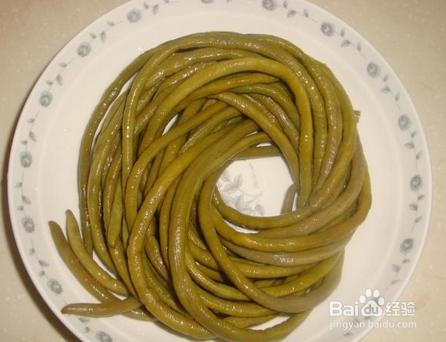 再放入酸豆角合炒,接着放蒜泥、干椒末、酱油拌炒,加清水50克焖熟,收干汤汁,放味精起锅即可