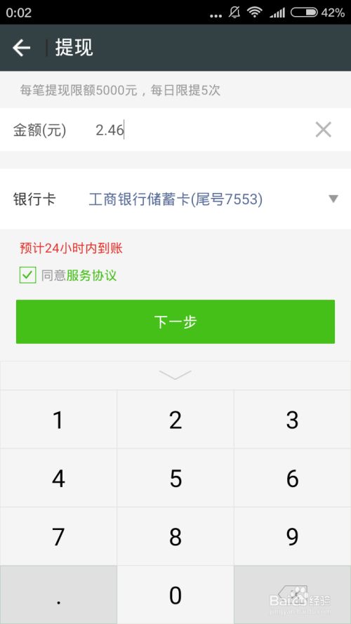 点击提现,就进入了下面图中所示的界面,看到没有,余额只有2.46元(红框所示),没有提示余额不足10元不可提现,那在蓝框处输入需要提现的金额,选好需要提现的银行卡(如果还没有绑定银行卡的,就按照提示一步步绑定银行卡)点击下一步。