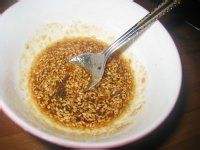 这时调料汁,也可以事先调好再切菜!碗中放入红酒醋,生抽,鸡粉,细砂糖,香油,炒香的白芝麻各适量,拌匀至糖化;
