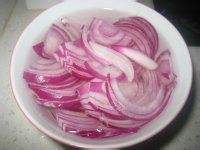 圆葱洗净去外衣,切成丝后泡冰水备用;