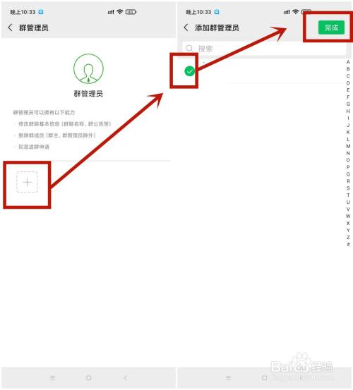 3.点击群管理员,再点击页面的 + 小标,勾选上自己的微信后点击完成,随后页面会显示自己已被群主设置成管理员。