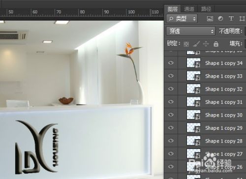 因背景为右上角亮(光源位置)投影会在左下角方向,按“Alt”+“←↓”复制图层,高端自己把握越多层越厚(复制个20-30层左右就差不多了)。