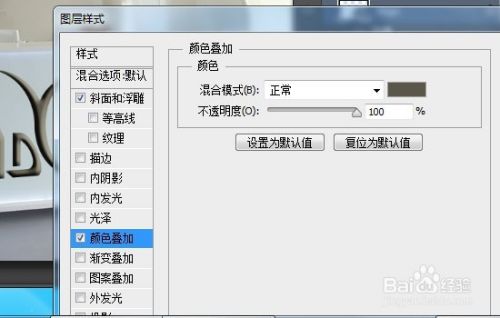 结合背景颜色这种logo厚度方向的颜色,图层样式——颜色叠加——因我这边背我准备吧logo做成黑色的,结合白色背景,把颜色设置成了灰色。