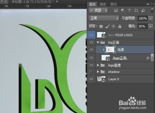 给logo添加一个场景光影图层(模拟logo表面反射场景效果)透明度调低到20-30%即可。