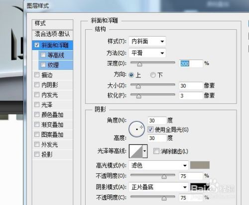 给logo图层添加一个斜面浮雕图层样式——选择内斜面——深度大小可以自己调整刀合适的大小。(也可以参考我这边截图的参数,我做的图片大小3500*2300 PPI)