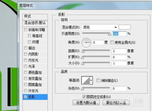 给图层添加一个白色投影效果来模拟logo边缘的反光效果,投影混合模式选择滤色,不透明度选择100 (就是要做全白的反光)。