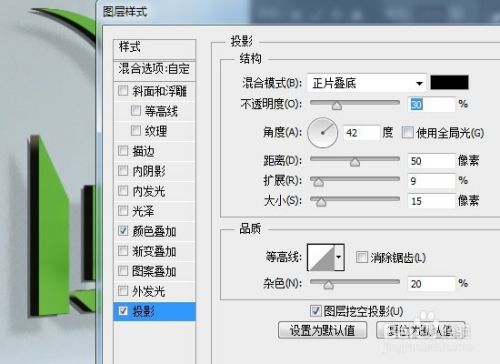 把刚刚做厚度的最底层复制一层,添加投影的图层样式,投影距离拉大一些。