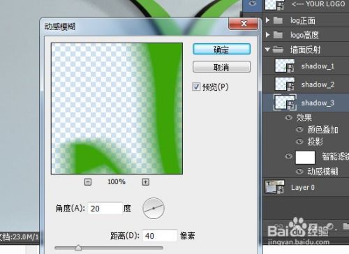 应墙面非镜面效果,反射物体菱角不会很清晰,所有我们再给反射图层做一个动感模糊效果处理。(记得logo图片一开始就要转智能对象,这是一个好的绘图习惯)