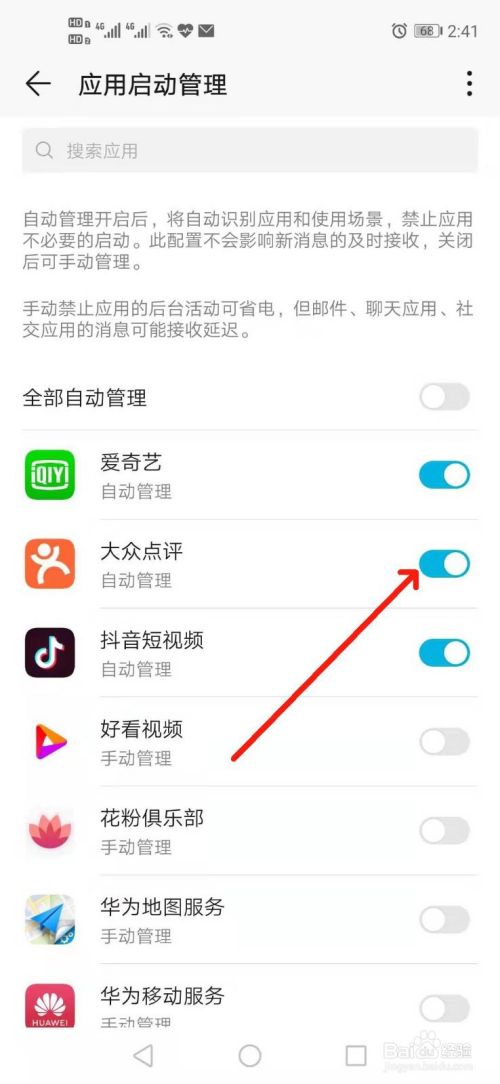 进入“应用启动管理”页面后,可看到手机安装好的各应用图标。示范禁止“大众点评”应用自启动,则点击“大众点评”应用后面的开关。
