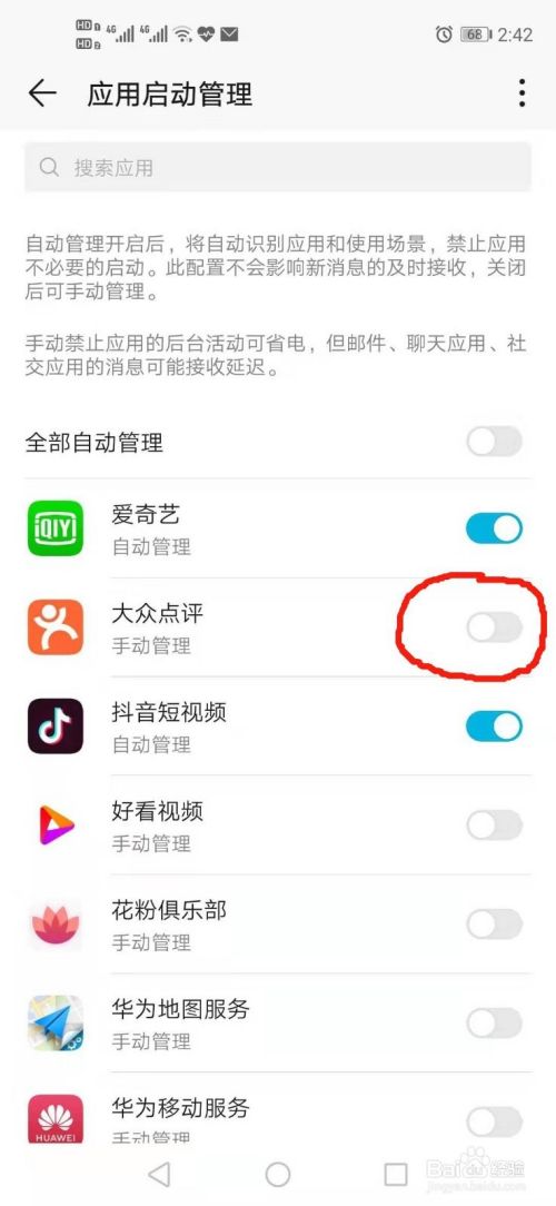 这时返加后,可见“大众点评”应用后的“开关”处理关闭状态,表示已禁止自启动。