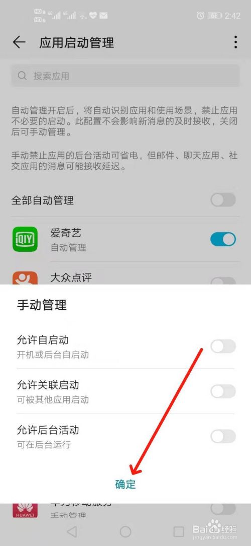 弹出窗口后,确认“允许自启动”、“允许关联启动”、“允许后台活动”三个选项均处于“关闭”状态,点击下面的“确定”按钮完成设置。